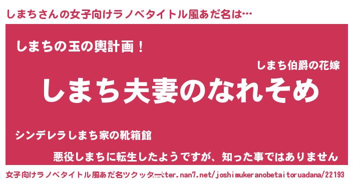 | 男性向けラノベタイトル風あだ名 | 『おまえをオタクにしてやるから、俺をしまちにしてくれ! 』 |