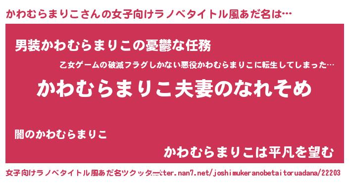 | 男性向けラノベタイトル風あだ名 | 『おまえをオタクにしてやるから、俺をかわむらまりこにしてくれ! 』 |