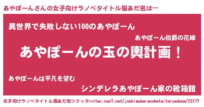 | 男性向けラノベタイトル風あだ名 | 『転生したらあやぽーんだった件』 |