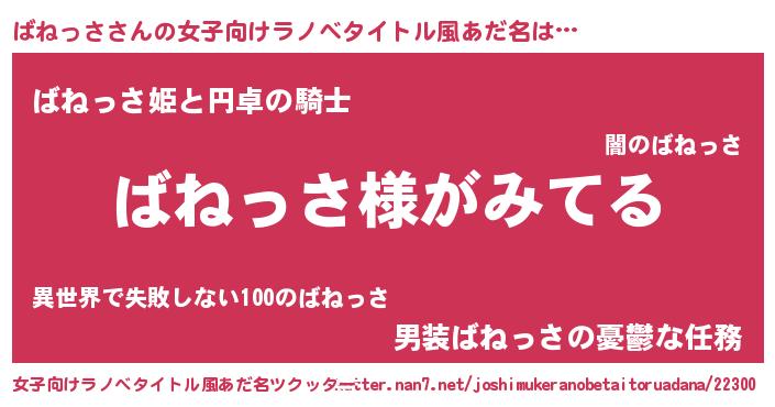 | 男性向けラノベタイトル風あだ名 | 『ばねっさの嫁は女の子じゃないと思った?』 |