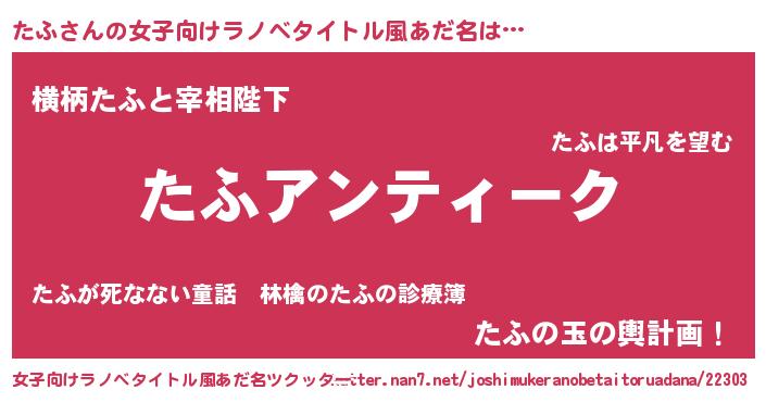 | 男性向けラノベタイトル風あだ名 | 『魔法科高校のたふ』『魔弾の王とたふ』 |