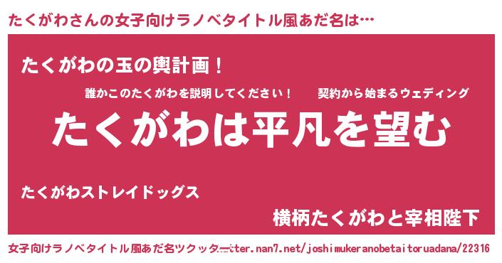 | 意味不明あだ名 | 『とにかく怪しいたくがわ』 |