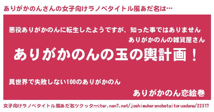 | 男性向けラノベタイトル風あだ名 | 『ありがかのん~年齢イコール彼女いない歴の魔法使い~』 |