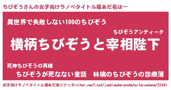 男性向けラノベタイトル風あだ名 | 『ちびぞうに滅ぼされるだけの簡単なお仕事です』 |