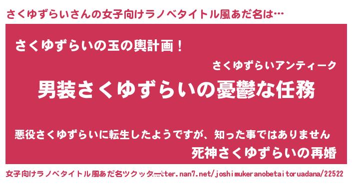 さくゆずらいさんの女子向けラノベタイトル風あだ名は… 『男装さくゆずらいの憂鬱な任務』『さくゆずらいの玉の輿計画!』『死神さくゆずらいの再婚』 ツクッター #女子向けラノベタイトル風あだ名ツクッター http://tkutter.nan7.net/joshimukeranobetaitoruadana/22522/