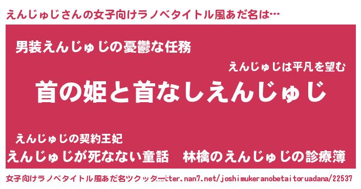 えんじゅじさんの女子向けラノベタイトル風あだ名は… 『首の姫と首なしえんじゅじ』『男装えんじゅじの憂鬱な任務』『えんじゅじが死なない童話 林檎のえんじゅじの診療簿』 ツクッター #女子向けラノベタイトル風あだ名ツクッター http://tkutter.nan7.net/joshimukeranobetaitoruadana/22537/
