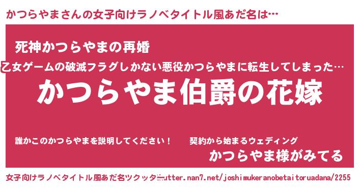 | 男性向けラノベタイトル風あだ名 | 『うちの娘の為ならば、俺はもしかしたらかつらやまも倒せるかもしれない。』 |