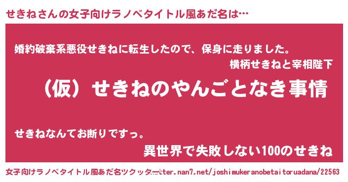 | 男性向けラノベタイトル風あだ名 | 『せきねの憂鬱』『セキネスレイヤー』 |