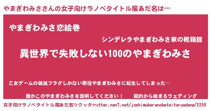 | 男性向けラノベタイトル風あだ名 | 『やまぎわみさという概念が存在しない退屈な世界 』 |