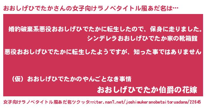 | 男性向けラノベタイトル風あだ名 | 『この素晴らしい世界におおしげひでたかを!』 |