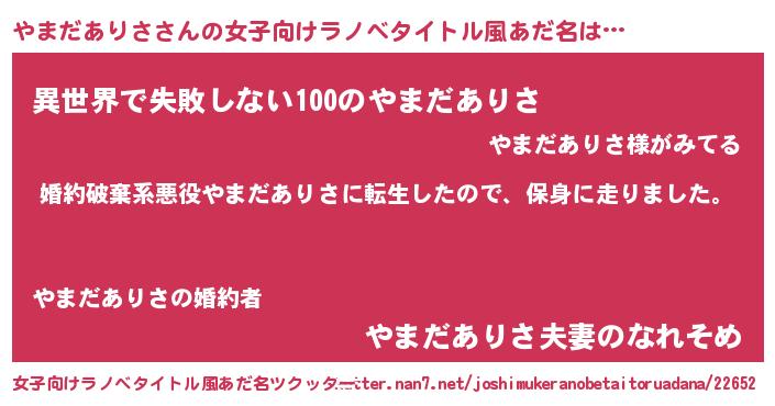 やまだありささんの女子向けラノベタイトル風あだ名は… 『婚約破棄系悪役やまだありさに転生したので、保身に走りました。』『異世界で失敗しない100のやまだありさ』『やまだありさ夫妻のなれそめ』 ツクッター #女子向けラノベタイトル風あだ名ツクッター http://tkutter.nan7.net/joshimukeranobetaitoruadana/22652/