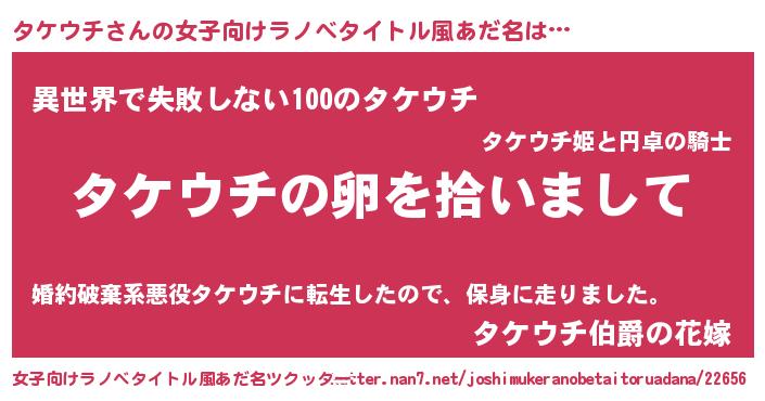 | 男性向けラノベタイトル風あだ名 | 『ダンジョンにタケウチを求めるのは間違っているだろうか』 |