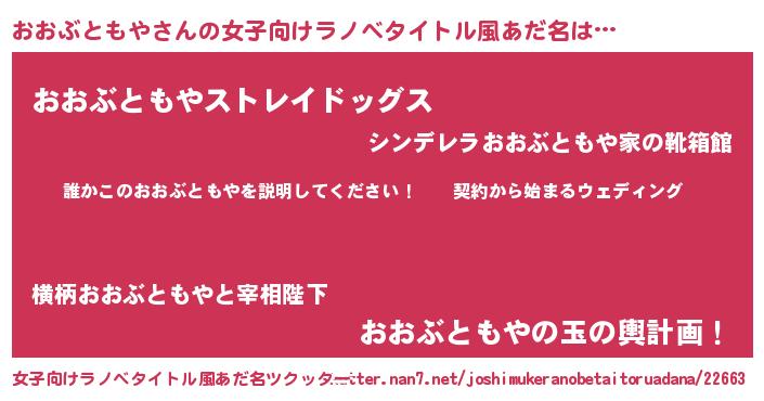 | 男性向けラノベタイトル風あだ名 | 『オオブトモヤアートオンライン』 |