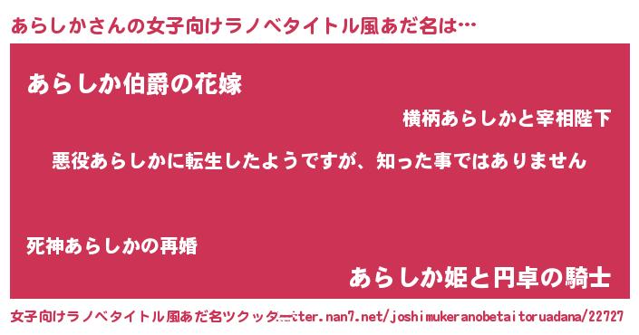 | 男性向けラノベタイトル風あだ名 | 『この素晴らしい世界にあらしかを!』 |