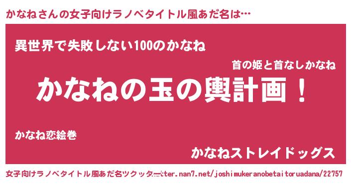 | 男性向けラノベタイトル風あだ名 | 『転生したらかなねだった件』 |