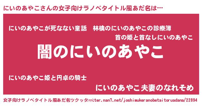 | 男性向けラノベタイトル風あだ名 | 『Re:にいのあやこから始める異世界生活』 |