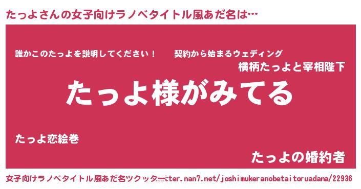 | 男性向けラノベタイトル風あだ名 | 『たっよの嫁は女の子じゃないと思った?』 |