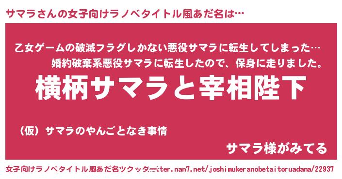 | 男性向けラノベタイトル風あだ名 | 『サマラに滅ぼされるだけの簡単なお仕事です』 |