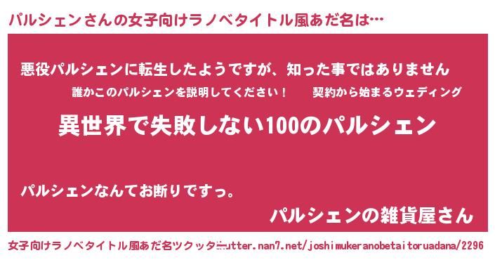 パルシェンさんの女子向けラノベタイトル風あだ名は… 『異世界で失敗しない100のパルシェン』『悪役パルシェンに転生したようですが、知った事ではありません』『パルシェンの雑貨屋さん』 ツクッター #女子向けラノベタイトル風あだ名ツクッター http://tkutter.nan7.net/joshimukeranobetaitoruadana/2296/