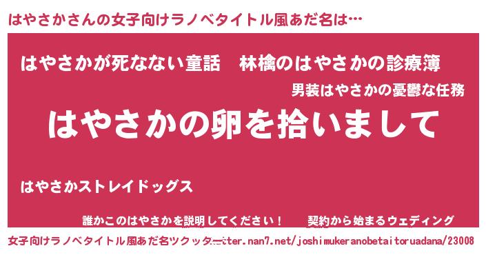 | 男性向けラノベタイトル風あだ名 | 『はやさかの嫁は女の子じゃないと思った?』 |