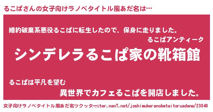 | 胡散臭い通販商品みたいなあだ名 | 『絶対に幸福をもたらす招き猫…その名も「るこぱ」』 |