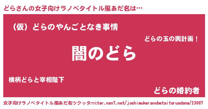 どらさんの女子向けラノベタイトル風あだ名は… 『闇のどら』『(仮)どらのやんごとなき事情』『どらの婚約者』 ツクッター #女子向けラノベタイトル風あだ名ツクッター http://tkutter.nan7.net/joshimukeranobetaitoruadana/23067/