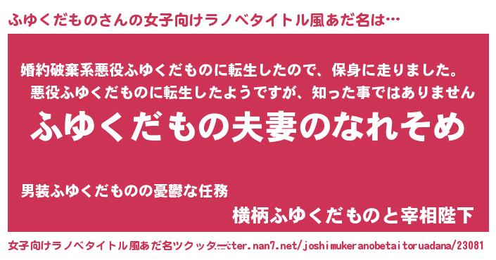 | 男性向けラノベタイトル風あだ名 | 『おまえをオタクにしてやるから、俺をふゆくだものにしてくれ! 』 |