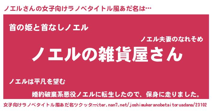 ノエルさんの女子向けラノベタイトル風あだ名は… 『ノエルの雑貨屋さん』『首の姫と首なしノエル』『婚約破棄系悪役ノエルに転生したので、保身に走りました。』 ツクッター #女子向けラノベタイトル風あだ名ツクッター http://tkutter.nan7.net/joshimukeranobetaitoruadana/23102/