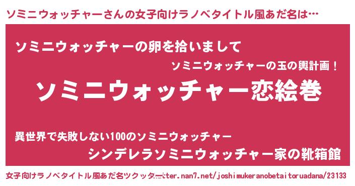 ソミニウォッチャーさんの女子向けラノベタイトル風あだ名は… 『ソミニウォッチャー恋絵巻』『ソミニウォッチャーの卵を拾いまして』『シンデレラソミニウォッチャー家の靴箱館』 ツクッター #女子向けラノベタイトル風あだ名ツクッター http://tkutter.nan7.net/joshimukeranobetaitoruadana/23133/