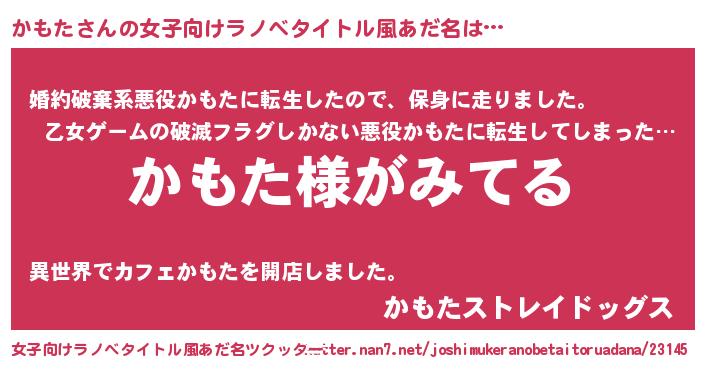 | 男性向けラノベタイトル風あだ名 | 『かもたの嫁は女の子じゃないと思った?』 |