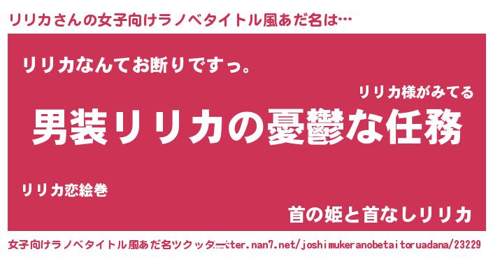 リリカさんの女子向けラノベタイトル風あだ名は… 『男装リリカの憂鬱な任務』『リリカなんてお断りですっ。』『首の姫と首なしリリカ』 ツクッター #女子向けラノベタイトル風あだ名ツクッター http://tkutter.nan7.net/joshimukeranobetaitoruadana/23229/
