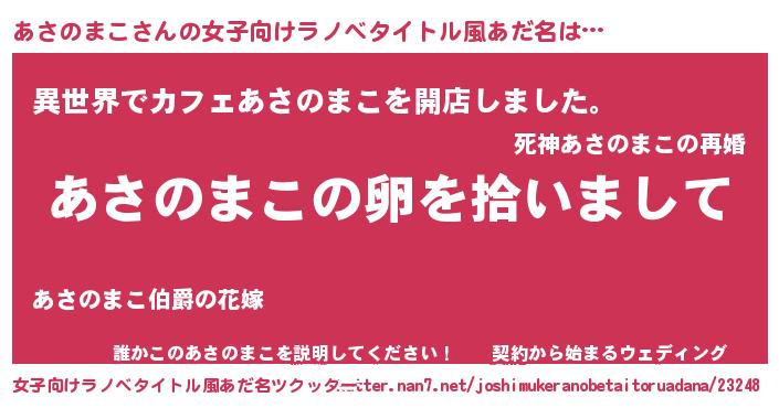 | 男性向けラノベタイトル風あだ名 | 『あさのまこの嫁は女の子じゃないと思った?』 |
