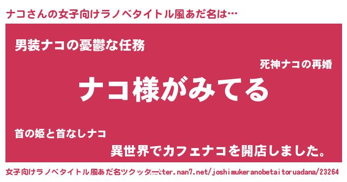 | 男性向けラノベタイトル風あだ名 | 『ナコの嫁は女の子じゃないと思った?』 |
