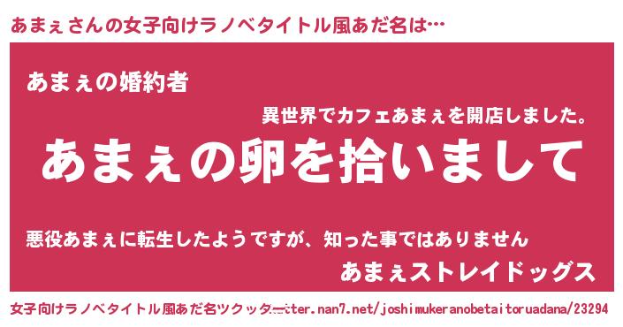 | 男性向けラノベタイトル風あだ名 | 『あまぇの嫁は女の子じゃないと思った?』 |