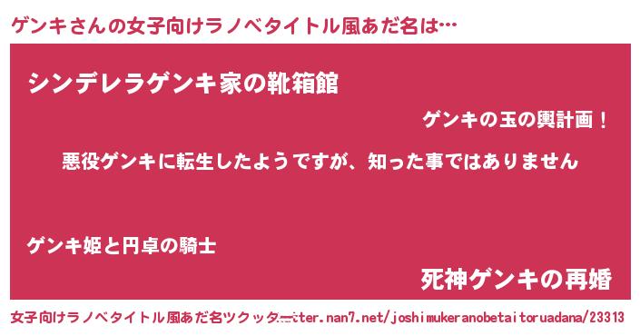 | 男性向けラノベタイトル風あだ名 | 『この素晴らしい世界にゲンキを!』 |