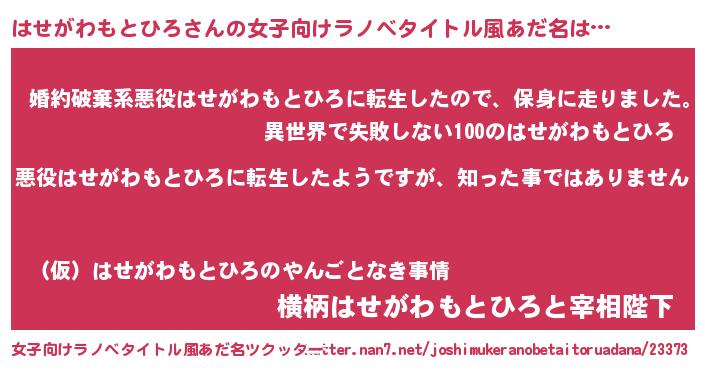 | 男性向けラノベタイトル風あだ名 | 『この素晴らしい世界にはせがわもとひろを!』 |