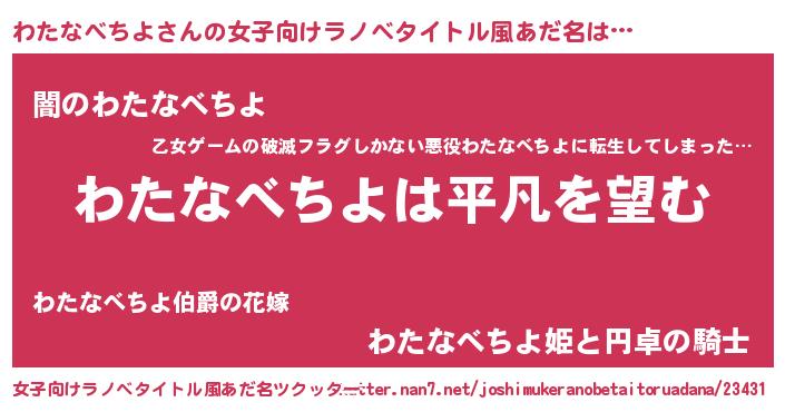 | 男性向けラノベタイトル風あだ名 | 『ダンジョンにわたなべちよを求めるのは間違っているだろうか』 |
