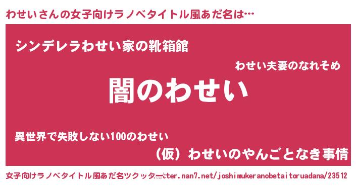 | 男性向けラノベタイトル風あだ名 | 『Re:わせいから始める異世界生活』 |