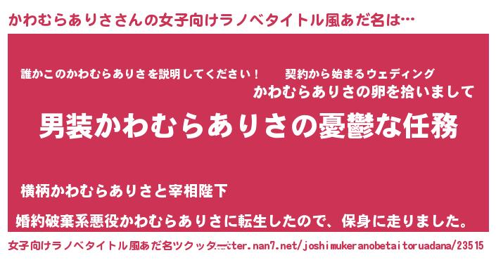 | 男性向けラノベタイトル風あだ名 | 『うちのかわむらありさが世界を掌握している!』 |
