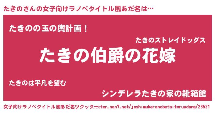 | 男性向けラノベタイトル風あだ名 | 『やはりたきのの青春ラブコメはまちがっている 』 |