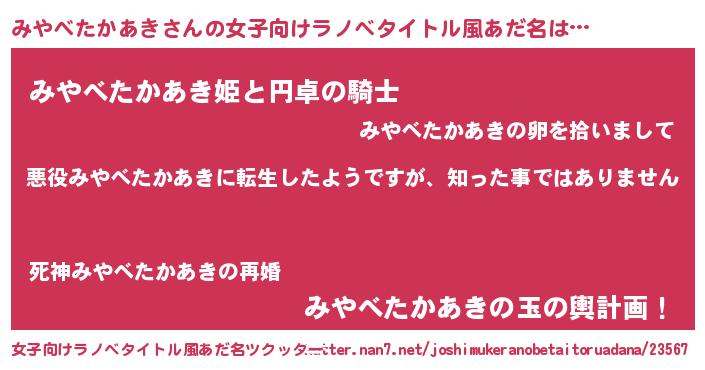 | 男性向けラノベタイトル風あだ名 | 『この素晴らしい世界にみやべたかあきを!』 |