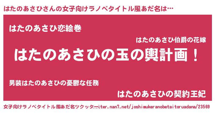 | 男性向けラノベタイトル風あだ名 | 『転生したらはたのあさひだった件』 |