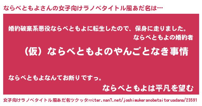 ならべともよさんの女子向けラノベタイトル風あだ名は… 『(仮)ならべともよのやんごとなき事情』『婚約破棄系悪役ならべともよに転生したので、保身に走りました。』『ならべともよは平凡を望む』 ツクッター #女子向けラノベタイトル風あだ名ツクッター http://tkutter.nan7.net/joshimukeranobetaitoruadana/23591/