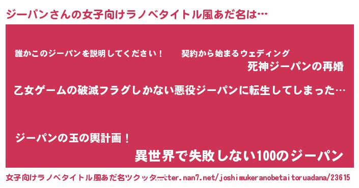 | 男性向けラノベタイトル風あだ名 | 『この素晴らしい世界にジーパンを!』 |