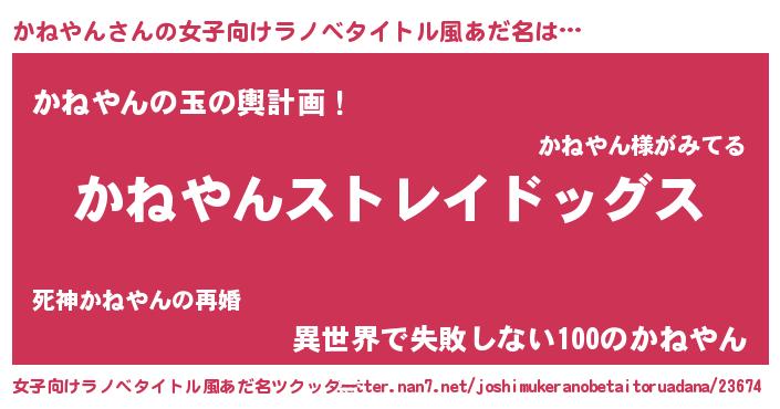 | 男性向けラノベタイトル風あだ名 | 『Re:かねやんから始める異世界生活』 |