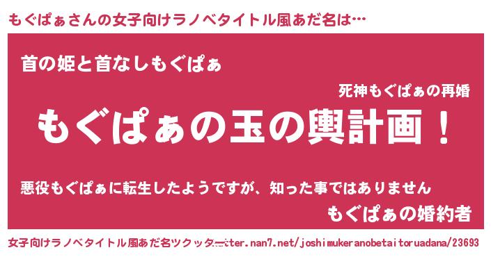 | 男性向けラノベタイトル風あだ名 | 『転生したらもぐぱぁだった件』 |