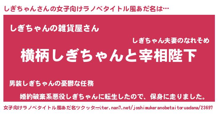 しぎちゃんさんの女子向けラノベタイトル風あだ名は… 『横柄しぎちゃんと宰相陛下』『しぎちゃんの雑貨屋さん』『婚約破棄系悪役しぎちゃんに転生したので、保身に走りました。』 ツクッター #女子向けラノベタイトル風あだ名ツクッター http://tkutter.nan7.net/joshimukeranobetaitoruadana/23697/