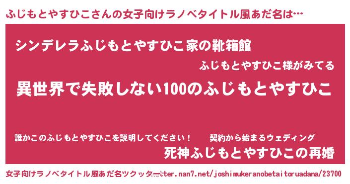 ふじもとやすひこさんの女子向けラノベタイトル風あだ名は… 『異世界で失敗しない100のふじもとやすひこ』『シンデレラふじもとやすひこ家の靴箱館』『死神ふじもとやすひこの再婚』 ツクッター #女子向けラノベタイトル風あだ名ツクッター http://tkutter.nan7.net/joshimukeranobetaitoruadana/23700/