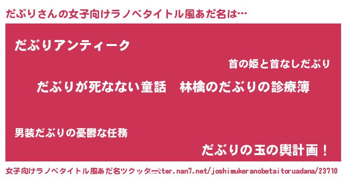 | 男性向けラノベタイトル風あだ名 | 『魔弾の王とだぶり』 |