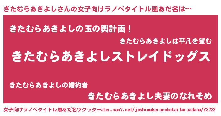 | 男性向けラノベタイトル風あだ名 | 『Re:きたむらあきよしから始める異世界生活』 |